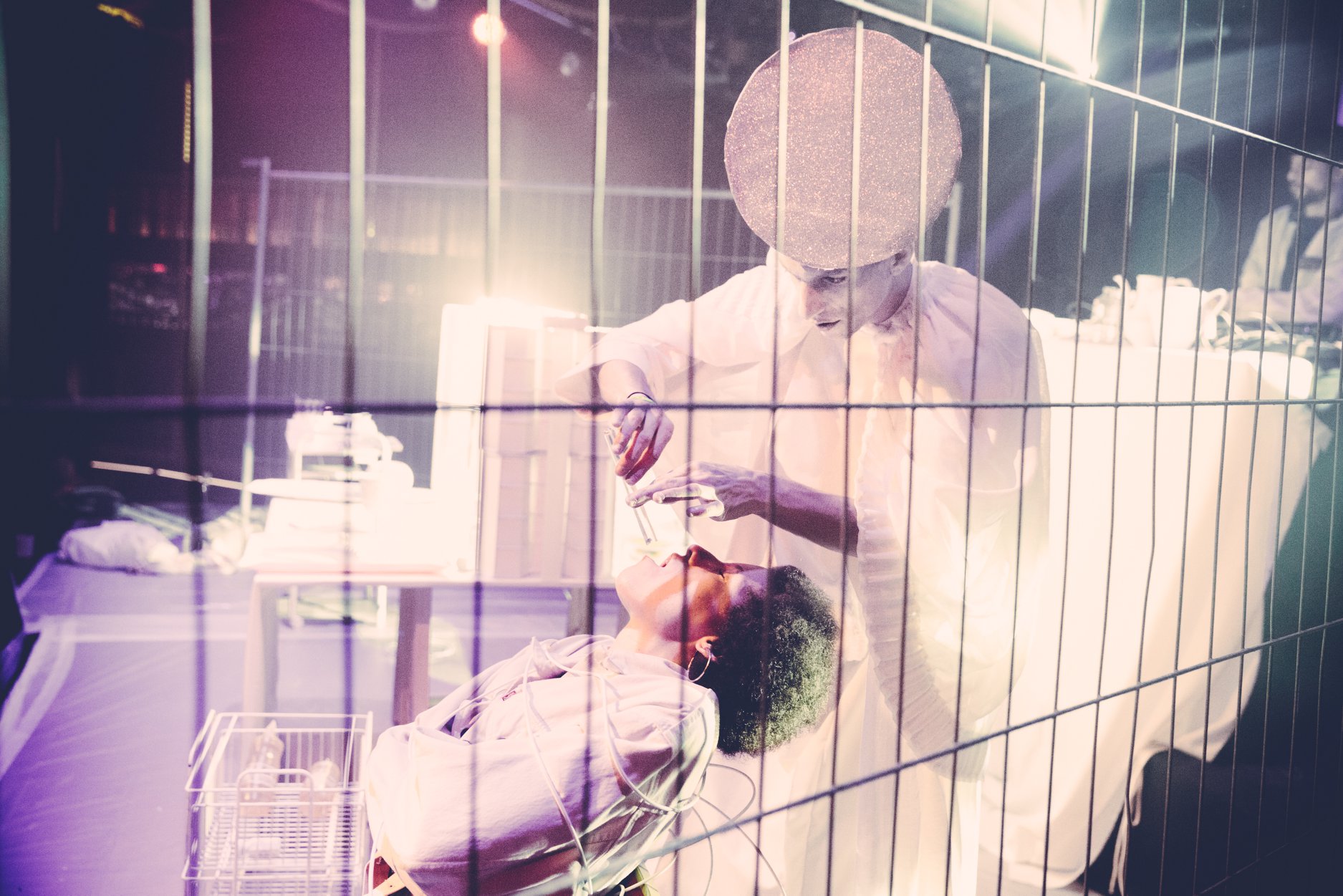 Costumes de scène Upcycling. Les performances, imaginées par BakaBaqa et mises en scène par Th3ology, se déroulent lors des soirées Techno Darkdisco Newave “Gouter de Nuit”.